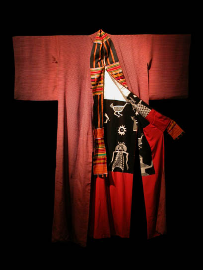 After interviewing Sanseis, 3rd generation Japanese Americans who are also people of mixed Asian descent, Dorothy Imagire, an artist of Japanese and Iranian descent, blends fabrics from different cultures to create unique personalized kimonos reflecting each person's ethnic and cultural backgrounds. She will also be exhibiting, for the first time, her latest project - baby blankets reflecting the next generation of people of mixed Asian/Japanese descent-Quapa (or quarter Asian-Pacific American) children. Dorothy Imagire has been creating photographs, installations, and garments about race, ethnicity and hybridity for her entire artistic career. Her works, like those of Fulbeck, are barometers marking the art public's interest in the now supposedly passe multiculturalism movement. Dorothy, like Kip, is Hapa, and I would include myself in that broad definition as someone of mixed Asian Ancestry. The most recent works of Dorothy's that I am familiar with are the beautiful Kimonos from her Mixed Identity Project. These stunning, contemplative textile works trace the Asian roots of the Sansei individuals for whom the garments are named. Dorothy's new work on exhibit at the Asian American Arts Centre continues in this vein. She has created textile works called "Quapa" Blankets, in which she uses textiles and other embellishments connected to the originating countries of the children of Hapa Sansei for whom the blankets are named.